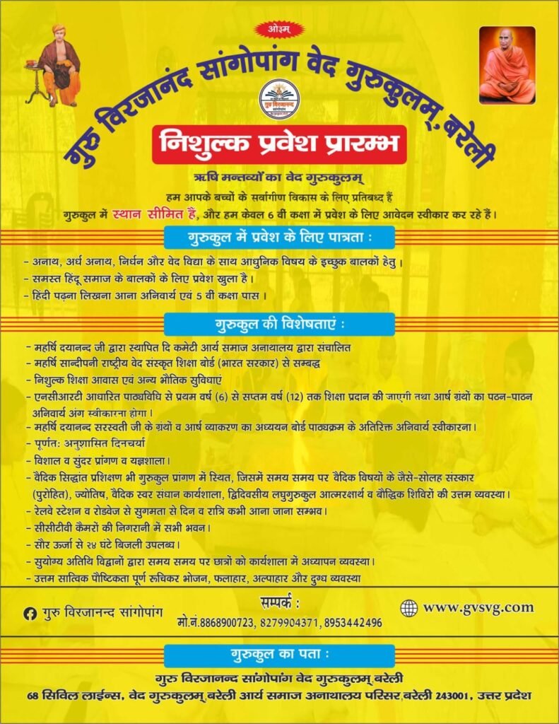 निशुल्क प्रवेश प्रारम्भ – गुरु विरजानंद सांगोपांग वेद गुरुकुलम्, बरेली